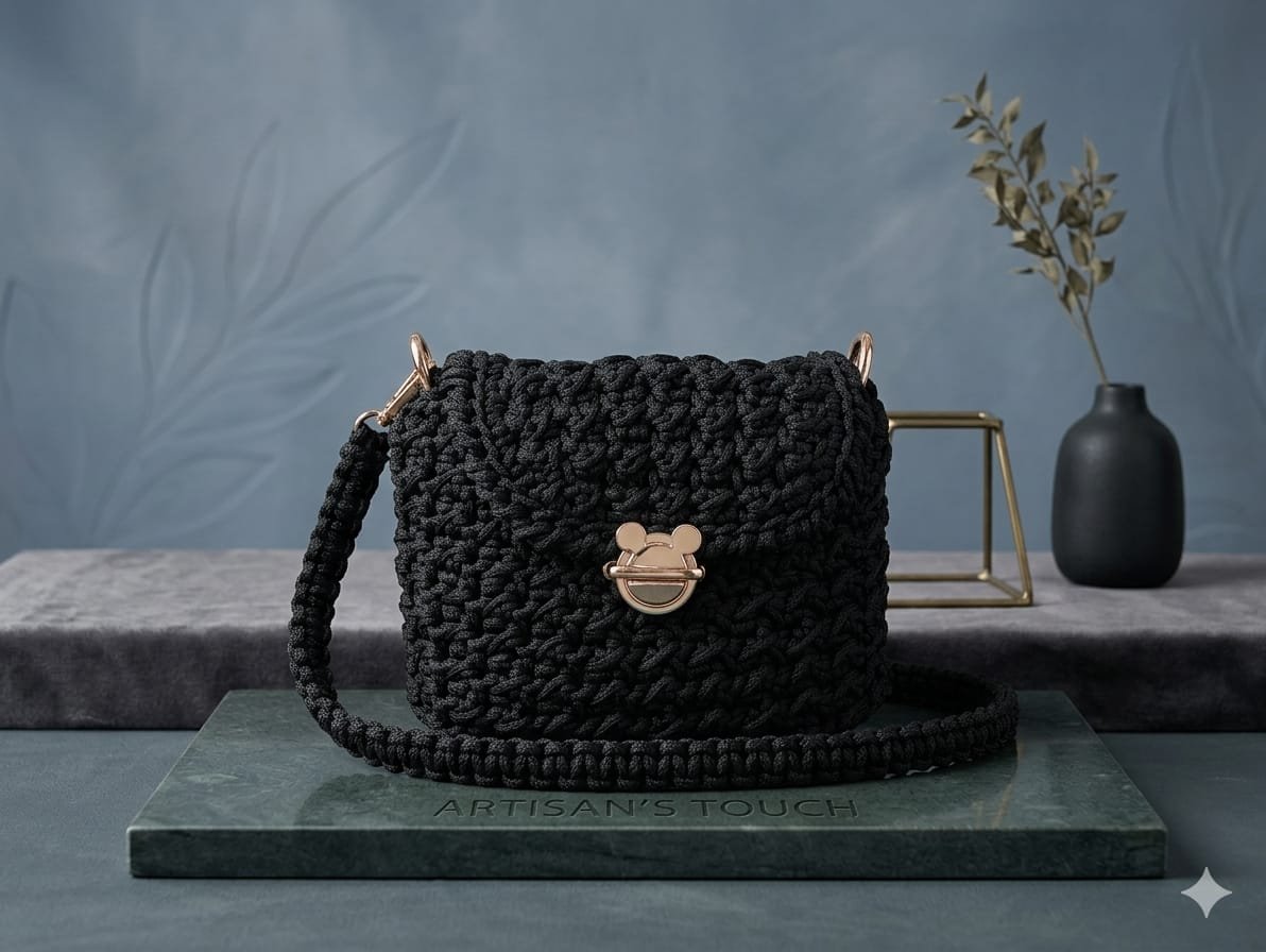حقيبة يد أنيقة مصنوعة بحرفية يدوية مميزة، بتصميم كروشيه عصري يضيف لمسة فريدة إلى إطلالتك. تتميز بلونها الكلاسيكي الجذاب وتفاصيلها المعدنية الراقية التي تمنحها مظهراً أنيقاً وعصرياً في نفس الوقت. مثالية للاستخدام اليومي أو للمناسبات الخاصة، حيث تجمع بين الأناقة والعملية في تصميم واحد.