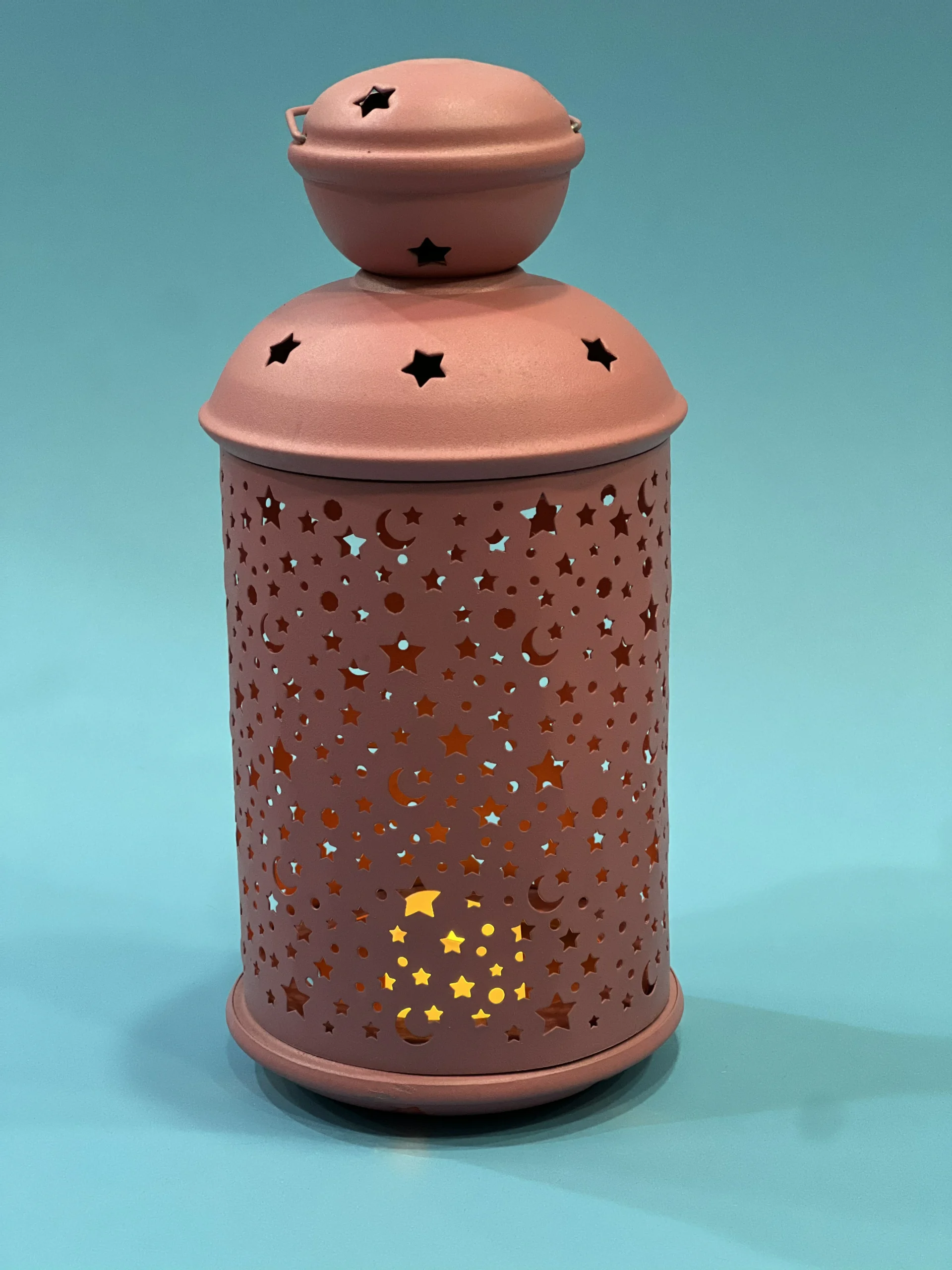 فانوس ديكور بتصميم أنيق ومميز، مصنوع من المعدن ومزخرف بنقوش دقيقة على شكل نجوم وأهلة تسمح بمرور الضوء بشكل ناعم وجذاب. يتميز بشكله العصري ولمسته الراقية، مناسب لتزيين المنزل أو المساحات الداخلية خلال شهر رمضان، ويضفي أجواء دافئة وروحانية سواء تم استخدامه كقطعة زينة أو مع إضاءة خفيفة.