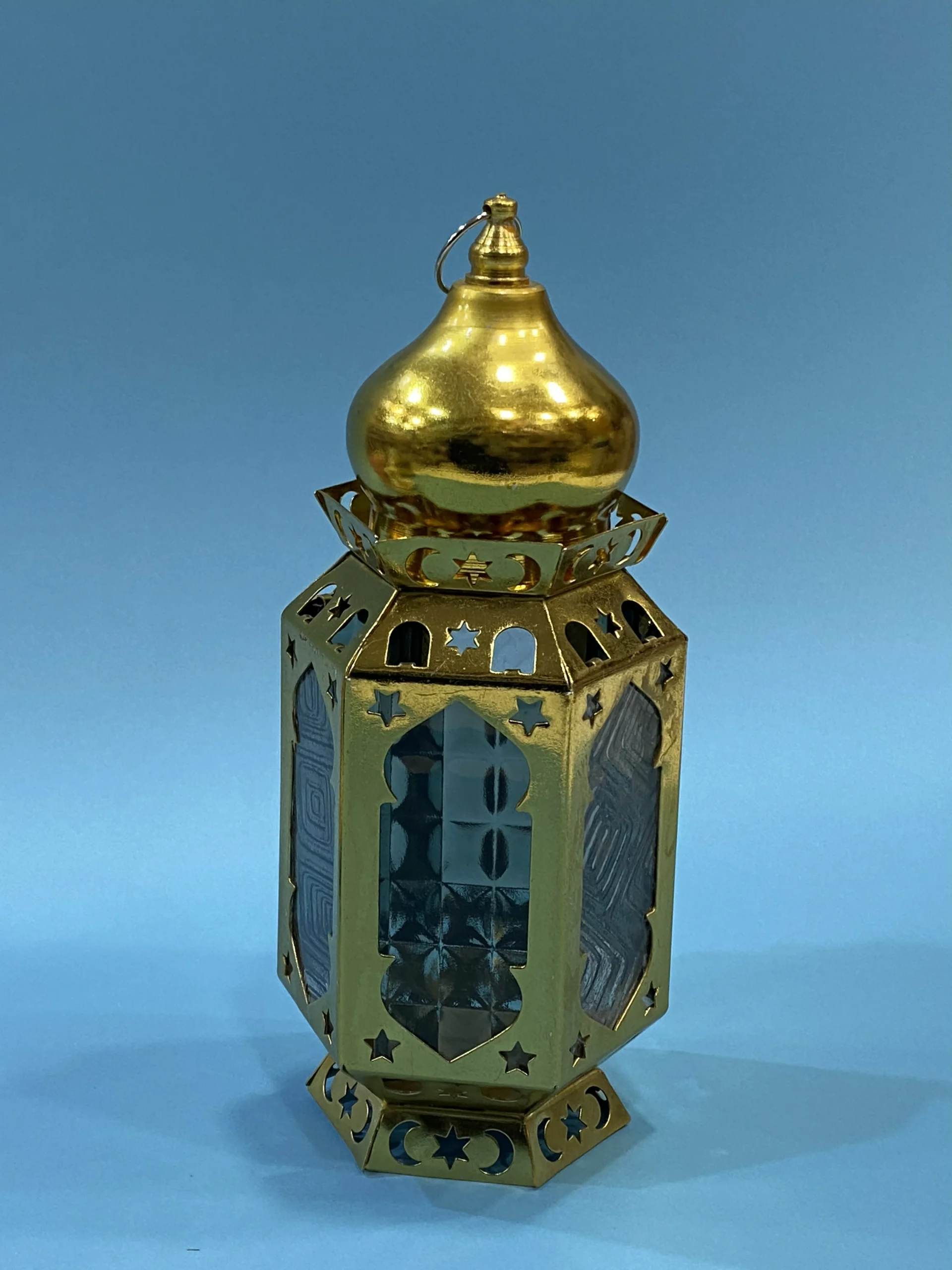 فانوس ديكور بتصميم أنيق ومميز، مصنوع من المعدن ومزخرف بنقوش دقيقة على شكل نجوم وأهلة تسمح بمرور الضوء بشكل ناعم وجذاب. يتميز بشكله العصري ولمسته الراقية، مناسب لتزيين المنزل أو المساحات الداخلية خلال شهر رمضان، ويضفي أجواء دافئة وروحانية سواء تم استخدامه كقطعة زينة أو مع إضاءة خفيفة